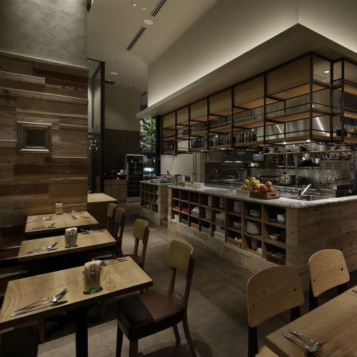 天井も高く、外の景色を見渡せるほどの開放的な店内は、まるでカリフォルニアにいるかのような気分にさせてくれる、ゆったりとした雰囲気。テラスやテーブル席、お一人様も大歓迎なカウンター席など、スタイリッシュな空間の中でお食事をお楽しみいただけます!木目の暖かさ感じる可愛い店内壁♪木のテーブルなど女子好みのオシャレな空間♪